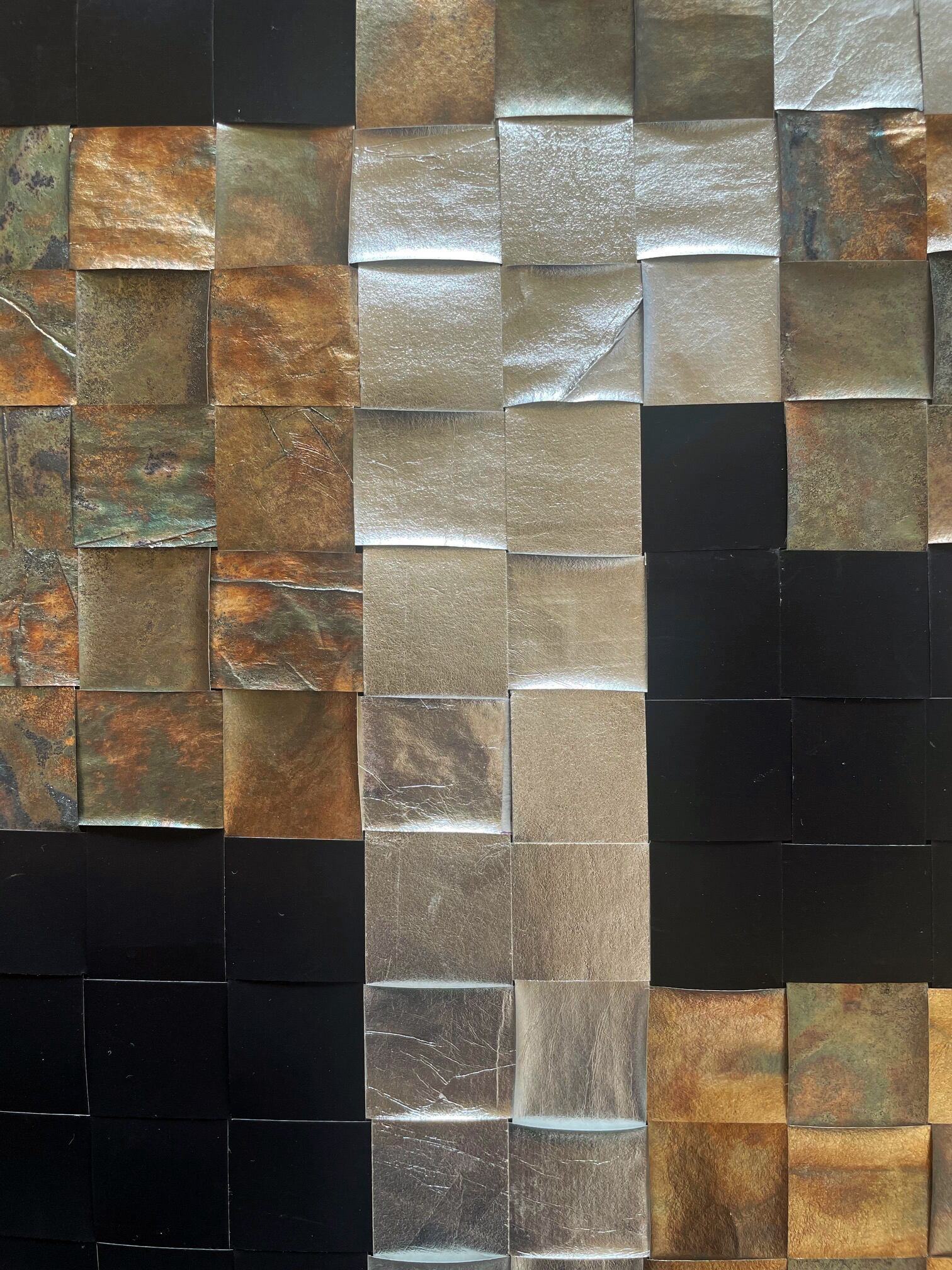 書・篆刻の「余白と均衡」の感覚を礎に、日本独自の素材である「箔」を使用したシリーズです。通常「貼る」箔を、手作業で「編む」ことにより、平面の中に奥行きのある構造(Structure)を生み出しています。