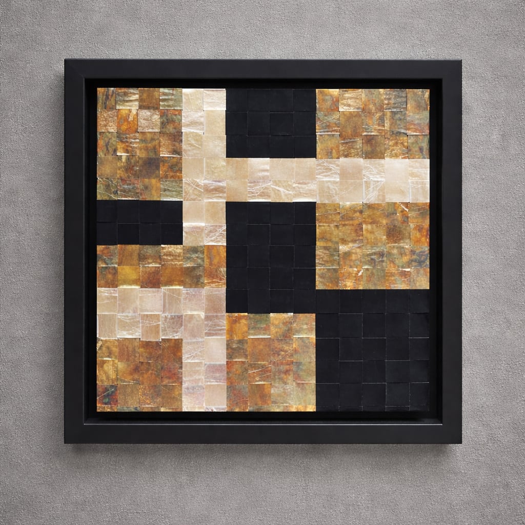書・篆刻の「余白と均衡」の感覚を礎に、日本独自の素材である「箔」を使用したシリーズです。通常「貼る」箔を、手作業で「編む」ことにより、平面の中に奥行きのある構造(Structure)を生み出しています。