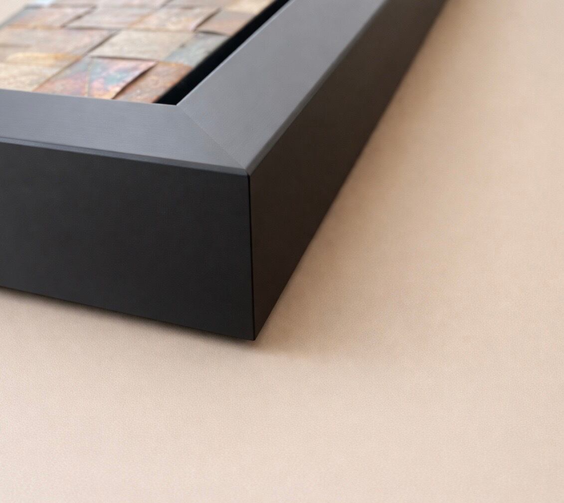 額装は、作品の重厚感を引き立てる黒のボックスフレームを採用。和でありながら、現代の空間に静謐な美を添えるモダンな佇まいに仕上げています。